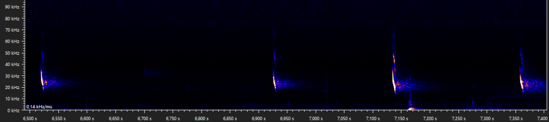 The following recording was made outside with no known roost in the area. The look and the sound of the calls look almost identical to the type C social calls of the brown-long eared bat recorded by J. Furmankiewicz (Middleton et al., 2020) and are very similar to the social calls shown in the last snippit of the previous recordings. No other calls of this bat were recorded. In this recording, two groups of three calls are clearly visible. Later in the recording, groups of two calls are present too.