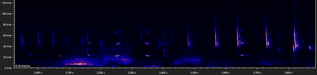 The following walking stick shaped social calls were recorded when Daubenton's bats were seen foraging above the water surface. It is unclear why these calls are emitted, but when they are recorded it is usually while foraging, and with more than one bat present. Similar calls are produced by the pond bat, another Myotis species, especially during what appears to be disputes between bats durin foraging activity (Middleton et al., 2022).