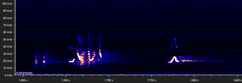 In the vicinity of the maternity roost, the same as the previous story after the juvenile made it safely back home, an interesting trill-like call was recorded. This call is shown in the snippit on the left. At first I thought it belonged more into the type D social call category, as one would assume with a trill, but after comparing it to the type A social call of a brown long-eared bat (Plecotus auritus) that also inhibits a trill-like shape, shown in the snippit on the right, I noticed the multi-frequency properties of the common pipistrelle call that belongs to type A social calls.