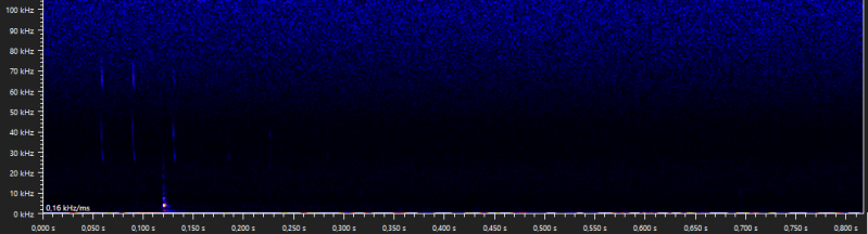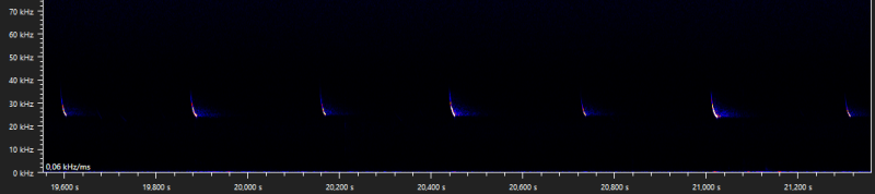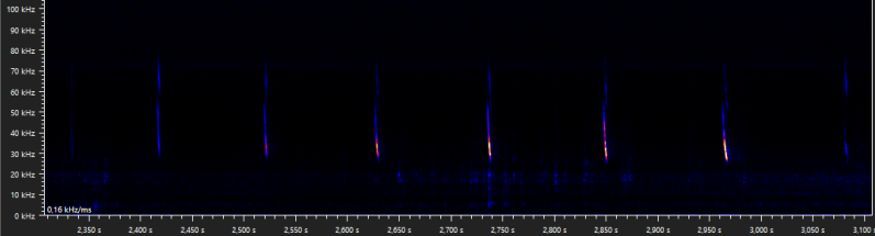 No clear peak frequency - FM calls - very high start frequency and high end frequency (above 40 kHz) - short inter-pulse intervals - short call length - very dry sound