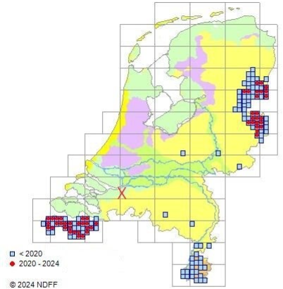 The map shows the distribution of C. leucadon in the Netherlands and the location of the recording is indicated as a red X. The recording was made 40 kilometers away from the species' expected range.
