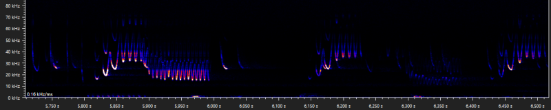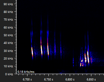 Some of the social calls in this recording are particulary low in frequency. To me, it feels like a new type of call is present that sounds like two 'stairs' of three steps. The first stairs goes from the first step at 8,5 - 9 kHz to two steps at 11 - 16 kHz (this sequence is emitted two times). The second stairs goes from a step at 16 kHz to a step at 17 kHz to a step at 17,5 - 18,5 kHz (this sequence is emitted three times). Three calls with an in frequency ascending ending are also present. Their start frequency are around 20 kHz and their end frequency are around 22,5+ kHz. I have seen these calls before, in the recording of Dennis on 2024-04-27 for example.