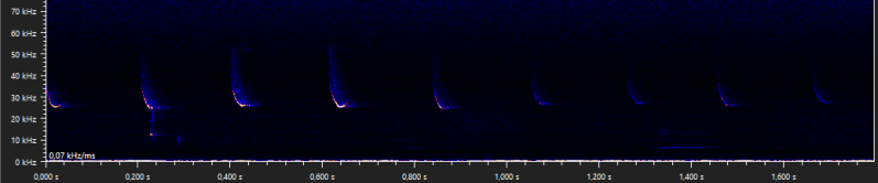 Even though I was still a little sceptic about the possible social calls in the previous recording, I came across similar looking calls (although very faint) in a recording near another maternity roost of common pipistrelles on a totally different location. At least 20 individual common pipistrelles reside in this roost. Seven bats, or perhaps more, were seen entering the roost and one was seen leaving the roost. They were swarming in front of the roost and individuals were tipping the roost's entrance aswell. This led me to believe that these may be from bats within the roost.
