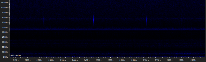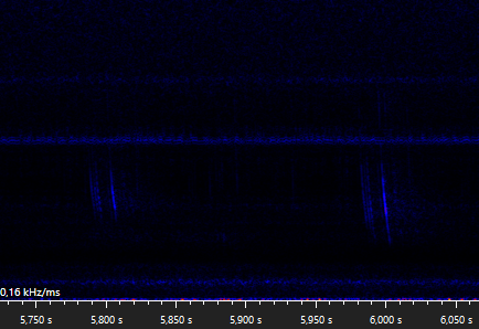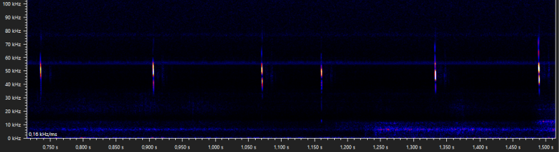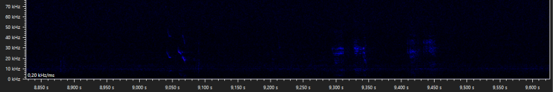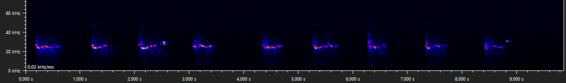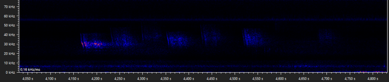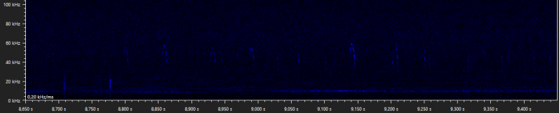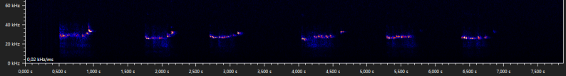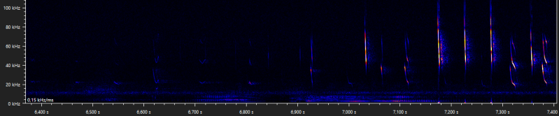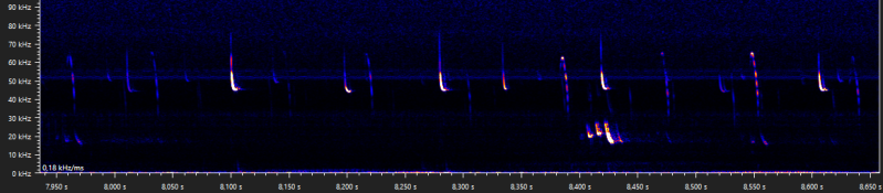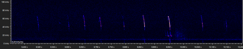 The following walking stick shaped social calls were recorded when Daubenton's bats were seen foraging above the water surface. It is unclear why these calls are emitted, but when they are recorded it is usually while foraging, and with more than one bat present. Similar calls are produced by the pond bat, another Myotis species, especially during what appears to be disputes between bats durin foraging activity (Middleton et al., 2022).