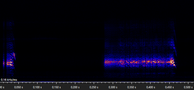 The following social calls were recorded at the same hibernation area (underground sites at a military base) as the first recordings on this page, again while we were counting the present bats. The first four snippits show type A social calls of whom the first three snippits are from a bat that was possibly mating, however the second bat was too hidden to say for sure. The fifth snippit shows multiple FM calls emitted by a male that was in a mating position on a female. The following snippits onwards contain type C social calls in the shape of arches, walking sticks, FM calls low in frequency and FM calls high in frequency.