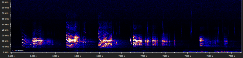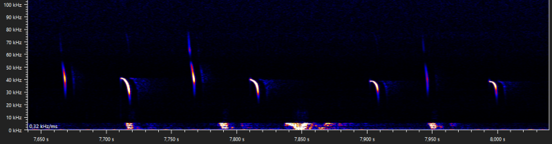 These series of FM calls (underneath the echolocation of the Nathusius' pipistrelle in the first snippit) were twice during the same night (at 23:37 and 00:06) and show a lot of similarity with a feeding buzz. Marc van de Sijpe stated that he would be surprised if calls like these would have a sole echolocation function of prey approach and capture and that it would not be surprising if these calls are aggresive calls as a reaction to kleptoparasitism - when another animal wants to steal the prey (Neil Middleton, et al., 2022).